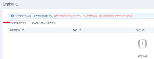您可以在 Huawei Cloud Toolkit 登录界面点击 访问秘钥 快速进入到华为云控制台, 点击 新增访问秘钥 进行访问秘钥申请. 秘钥申请时可适当填入备注信息.