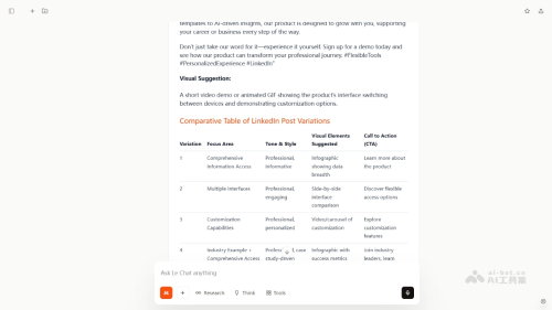 - 深度研究:点击“Research”按钮,输入复杂问题或研究主题,Le Chat 自动生成结构化的研究报告。