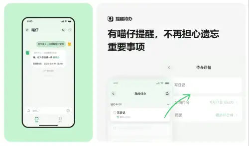 待办提醒:在与喵仔对话中输入 “提醒 + 提醒时间 + 事项” 可创建待办,回复 “我的待办” 或 “待办列表” 能查看所有未来待提醒的待办,方便用户管理时间和任务,避免遗忘重要事项。